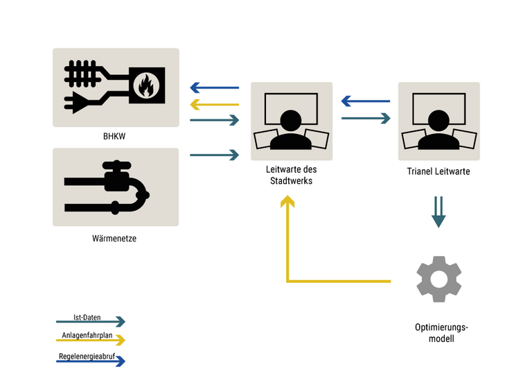 Zur Ermittlung des optimalen Anlagenbetriebs für ihre Kunden verfolgt Trianel einen modellbasierten, mathematischen Optimierungsansatz. Im Optimierungsmodell sind neben der Abbildung aller Fernwärme-Erzeugungsanlagen auch die Komponenten der Wärmenetze wie Übergabestellen und Speicher zu finden. Berücksichtigt werden zudem die Vertragsparameter möglicher Wärmelieferverträge und alle im Rahmen der Versorgung der Wärmenetze relevanten mittel- bis langfristigen Strom- und Gasgeschäfte des Stadtwerks. Die Einsatzweise der Anlagen des Fernwärmesystems stellt Trianel dem Kunden in Form von Fahrplanvorschlägen zu.