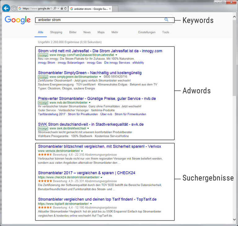 • Suchmaschinenwerbung (SEA): Über Google-Adwords können einzelne Tarife und Dienstleistungen zielgerichtet mit voller Kostenkontrolle (Zahlung nur per Klick) beworben werden. SEA kann kurzfristige Top-Platzierungen bei den Werbeanzeigen erzielen. Im Netzwerk könnten Strategien für eine erfolgreiche Bewerbung gemeinsam entwickelt werden. Die Datenanalyse könnte auf ein breiteres Fundament aufsetzen.