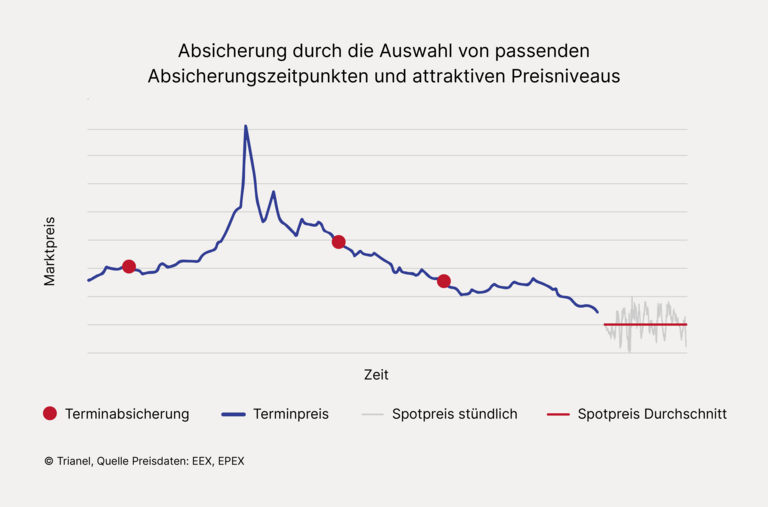 Die Trianel Experten gehen neue Wege und sichern Teile der erwartbaren Erzeugung aus einer Wind- oder PV-Anlage frühzeitig vor Lieferung am Terminmarkt ab. Durch die Wahl geeigneter Veräußerungszeitpunkte können die Volatilität sowie das hohe Niveau der Terminmarktpreise genutzt werden und fallenden Preisen durch eine frühzeitige Absicherung begegnet werden. Nicht nur die Strompreise an den Spotmärkten sind seit dem vergangenen Jahr durch eine hohe Volatilität mit hohen Preisspitzen gekennzeichnet, Tendenz aufgrund der Zunahme der erneuerbaren Erzeugung steigend. Auch die Terminmärkte hat die hohe Volatilität erreicht.