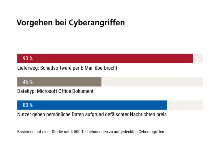 Die größte Schwachstelle beim Schutz von IT Systemen ist dabei der Mensch: In 94 % der aufgedeckten Cyberangriffe wurde Schadsoftware per E-Mail überbracht, so eine Studie des Kommunikationskonzerns Verizon(1). In 45 % der Fälle war der Dateityp ein Microsoft Office Dokument. Nutzer wurden in mehr als 80 % der Fälle dazu gebracht, persönliche Daten preiszugeben: etwa durch eine gefälschte Aufforderung des Administrators, doch bitte die Login-Daten zu ändern.